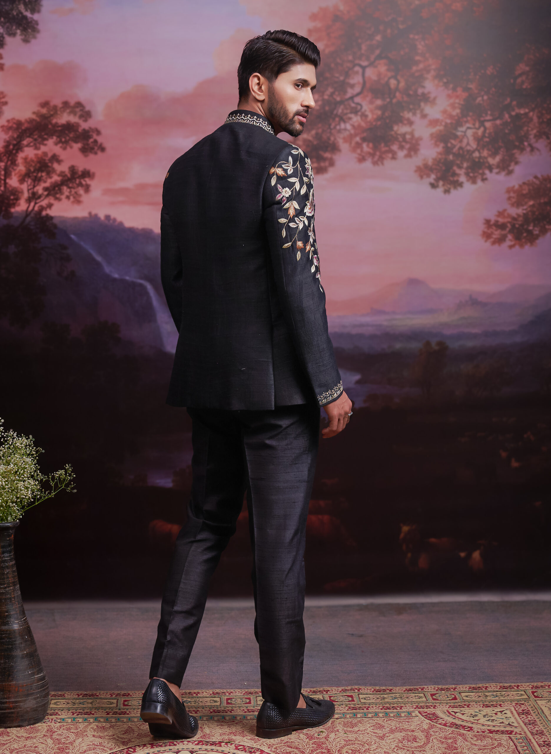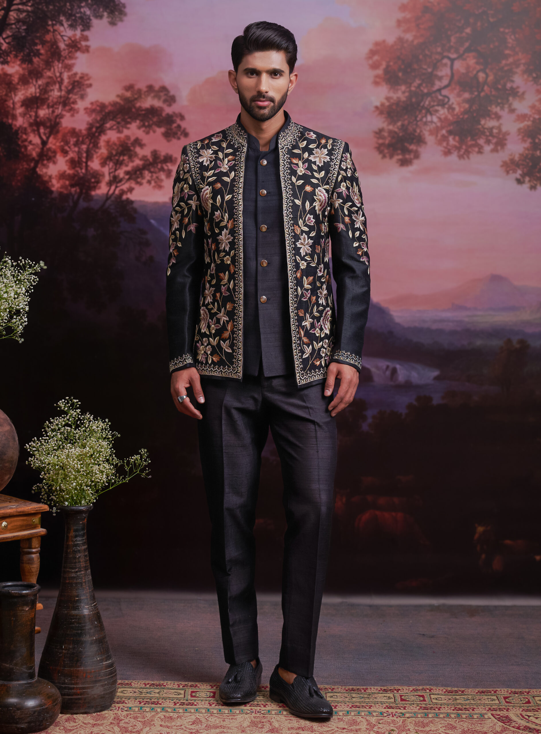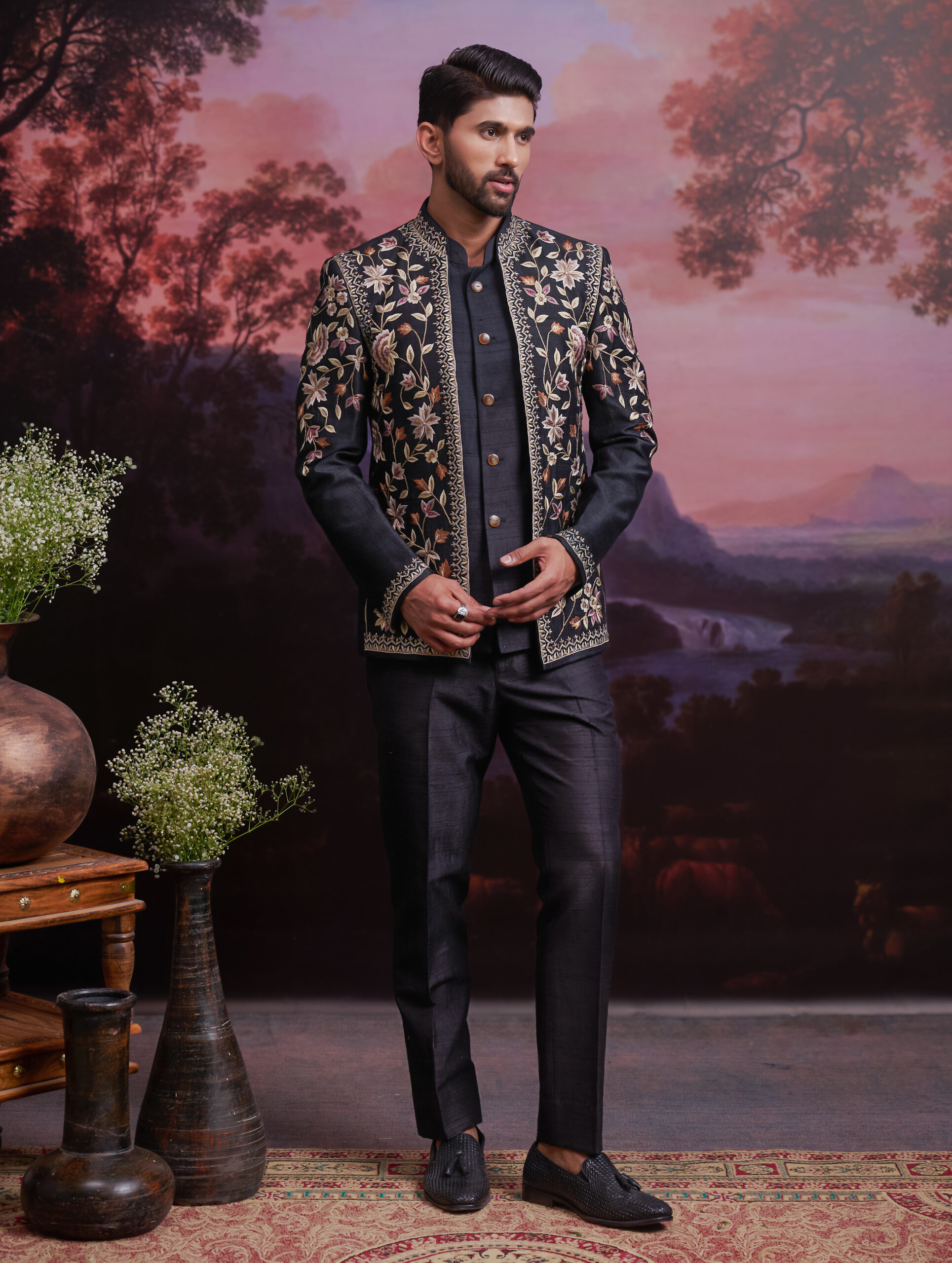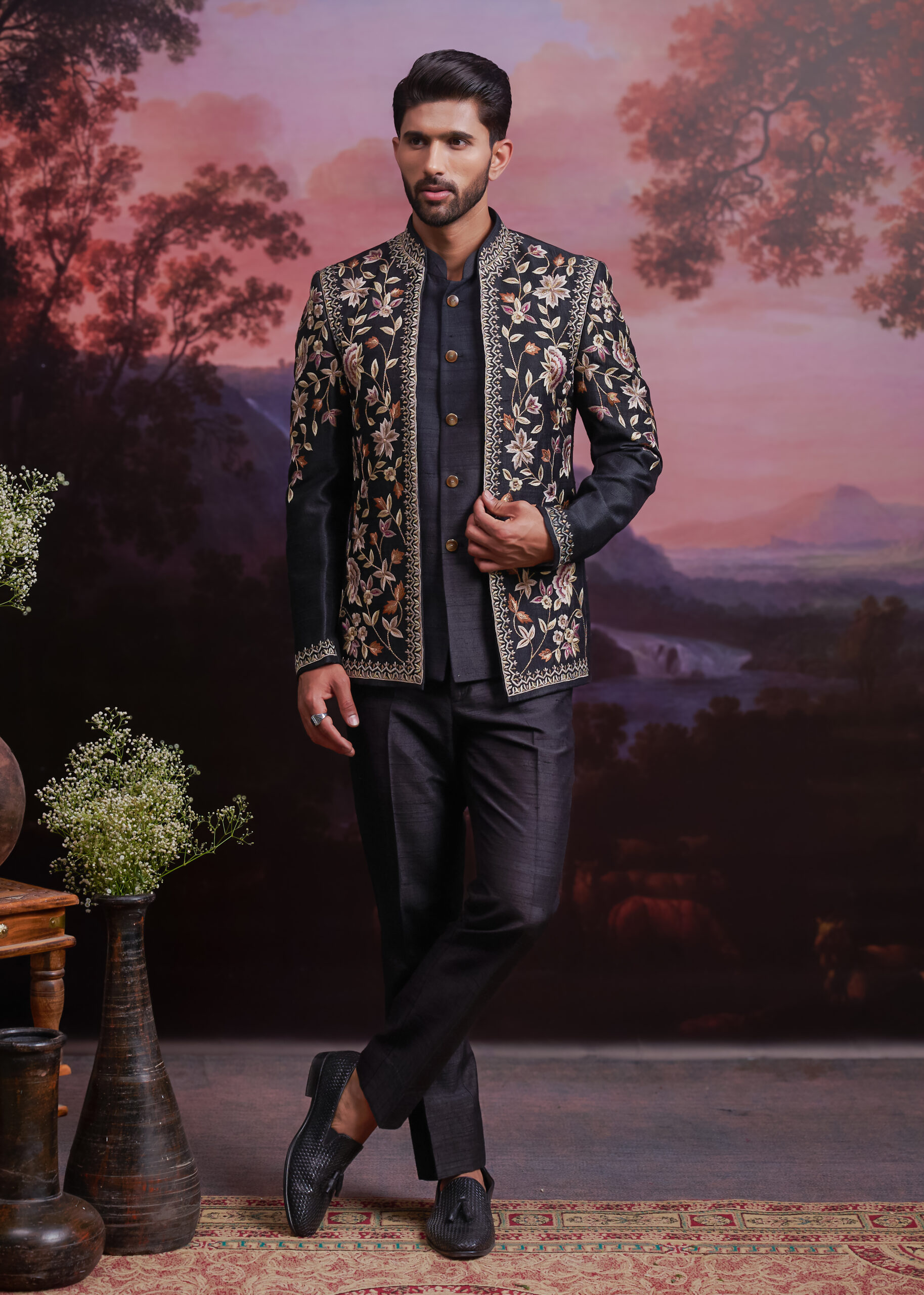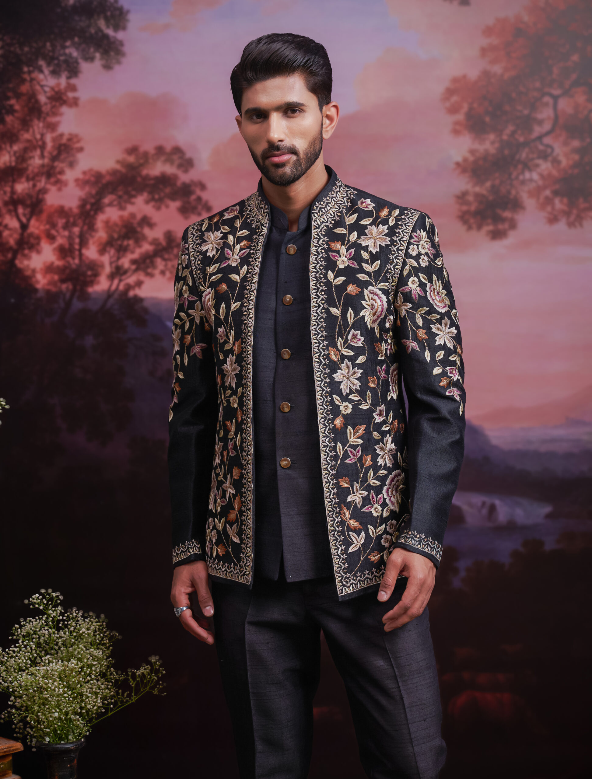 Step into royal sophistication with our Black Raw Silk Embroidered Open Bandhgala. Crafted from premium raw silk, this ensemble exudes a rich texture and refined charm. The open-front design adds a contemporary edge, while the delicate embroidery showcases exquisite craftsmanship. Perfect for weddings, receptions, and festive celebrations, this bandhgala ensures you stand out with elegance and grace. Pair it with tailored trousers or ethnic bottoms to complete a truly majestic look.