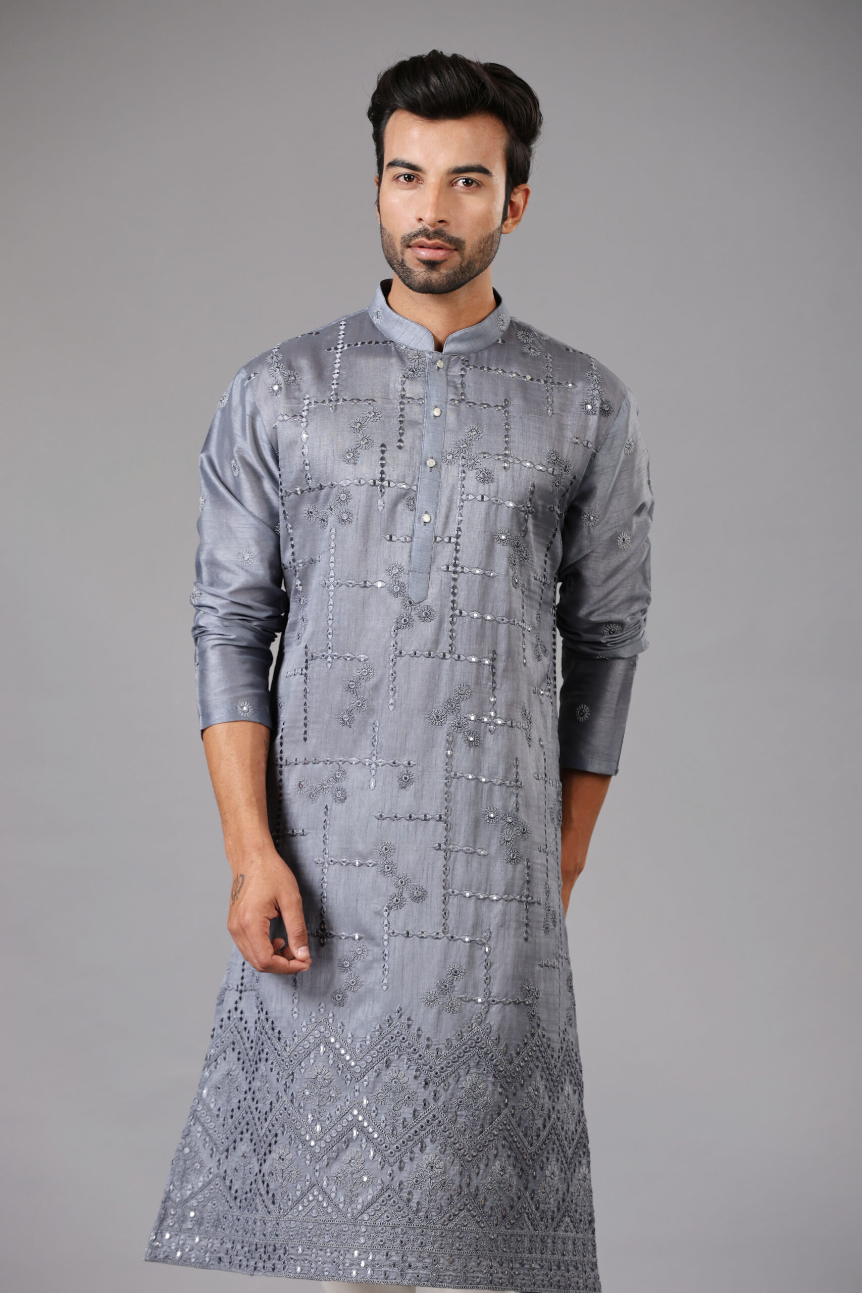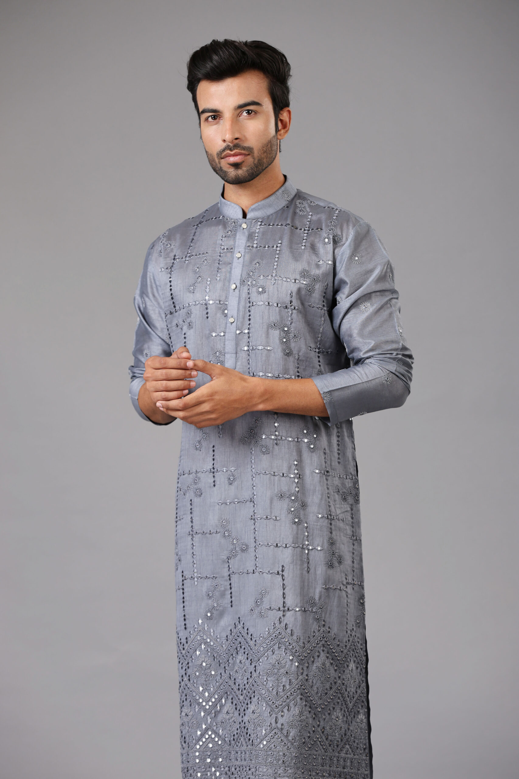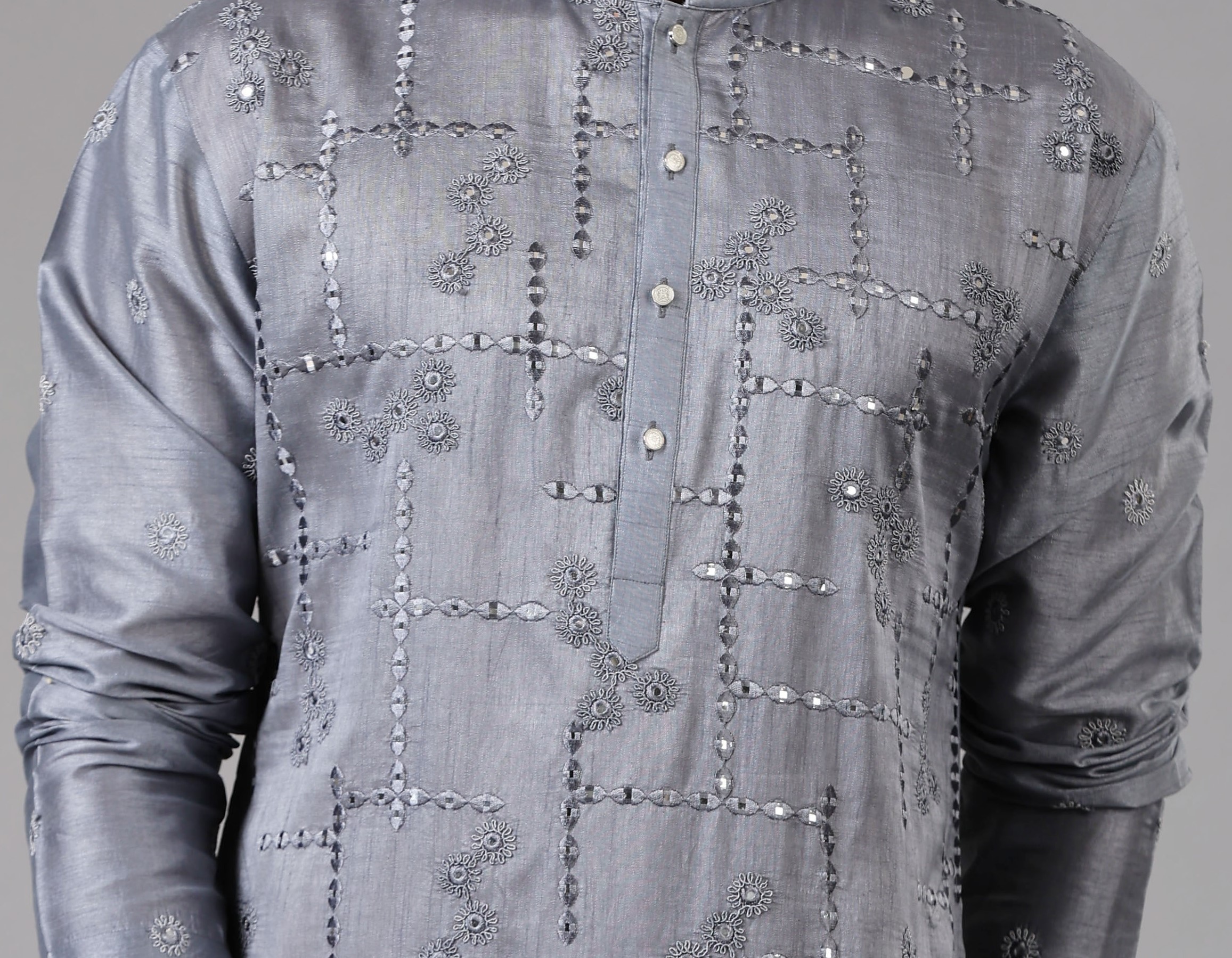 Dark Grey Kurta Set with intricate Mirror and Dori Work all over.
