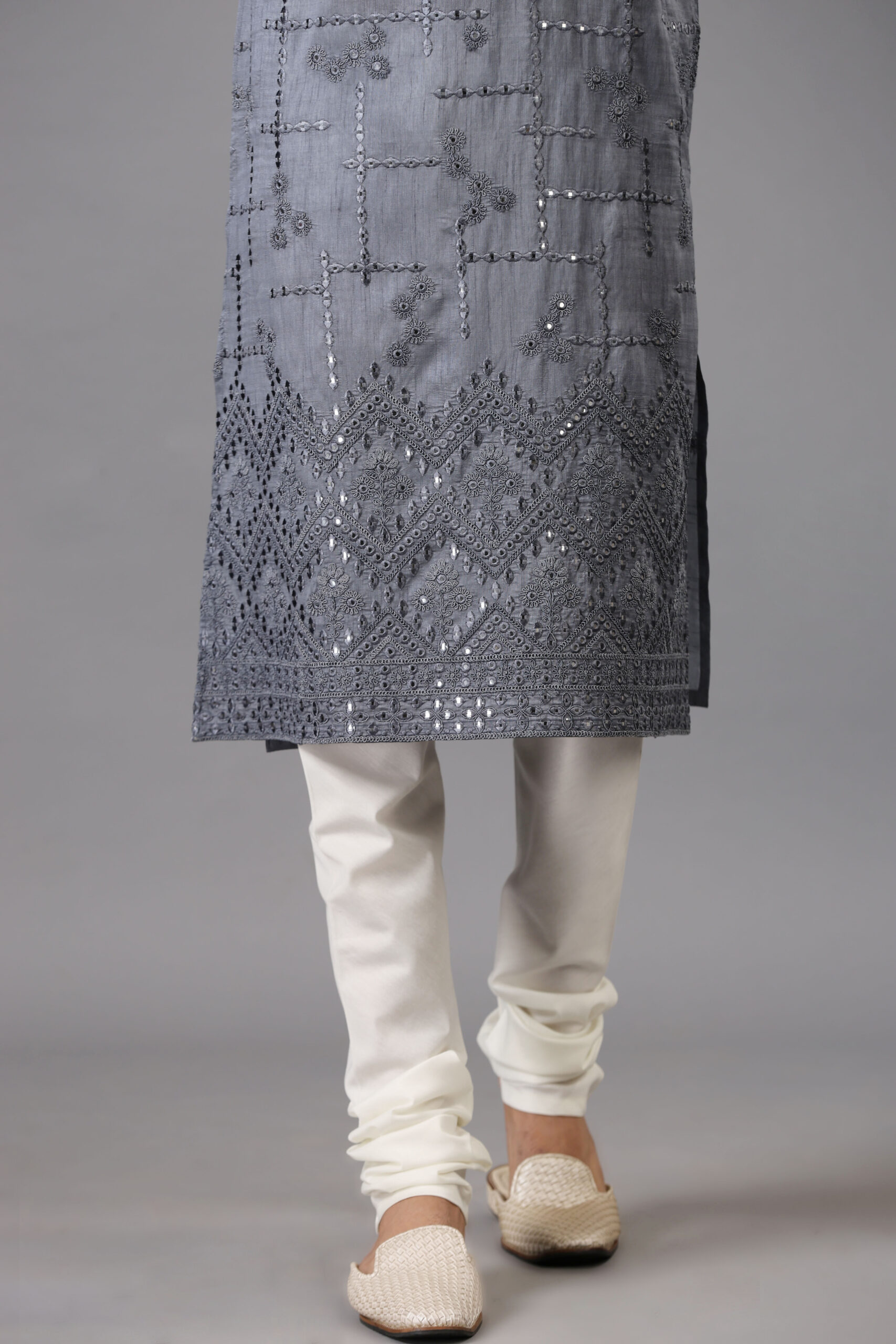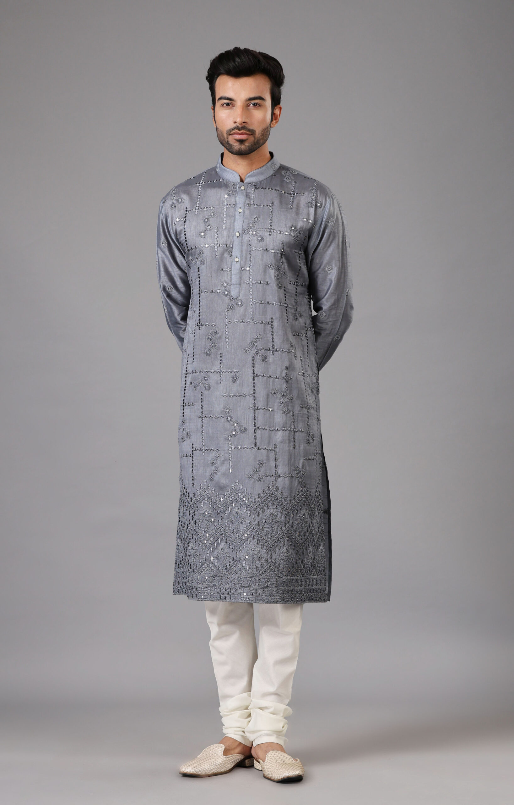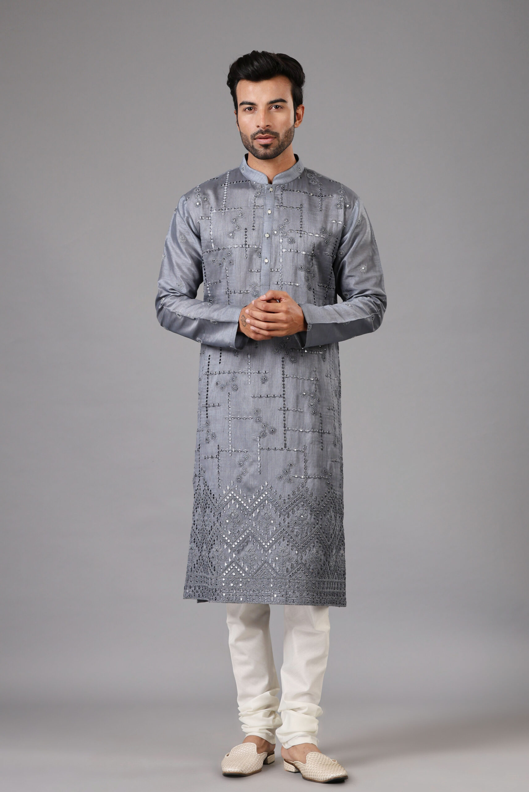 Dark Grey Kurta Set with intricate Mirror and Dori Work all over.