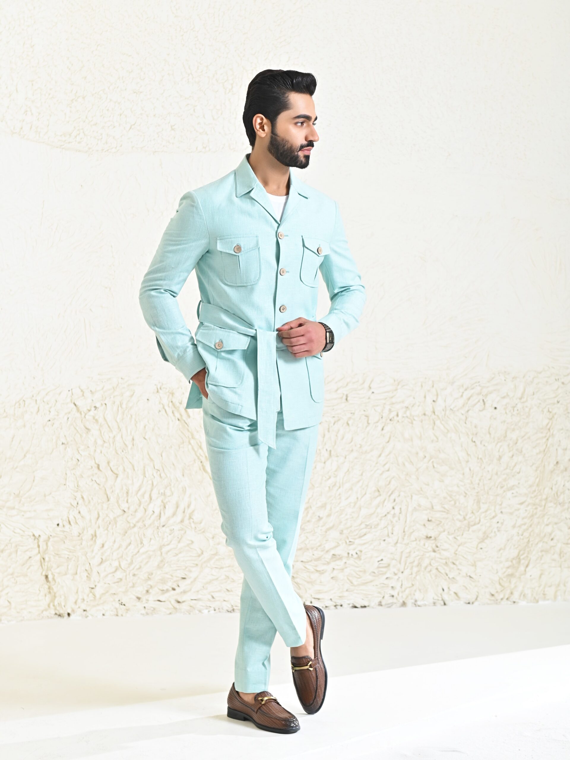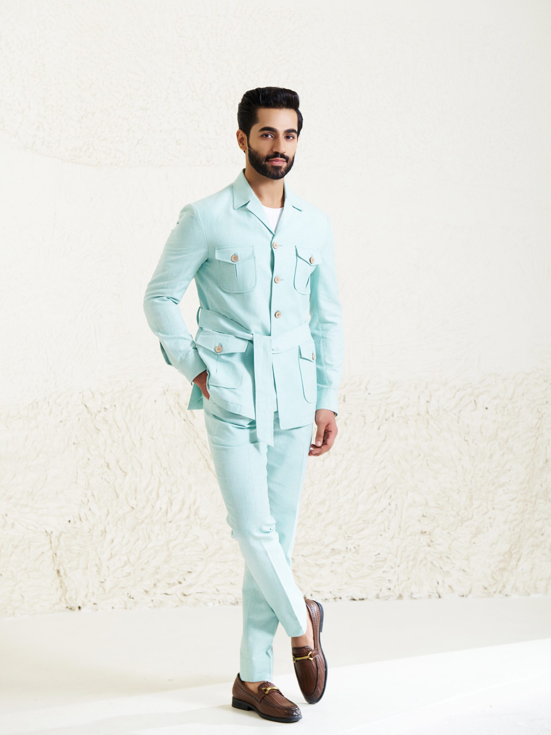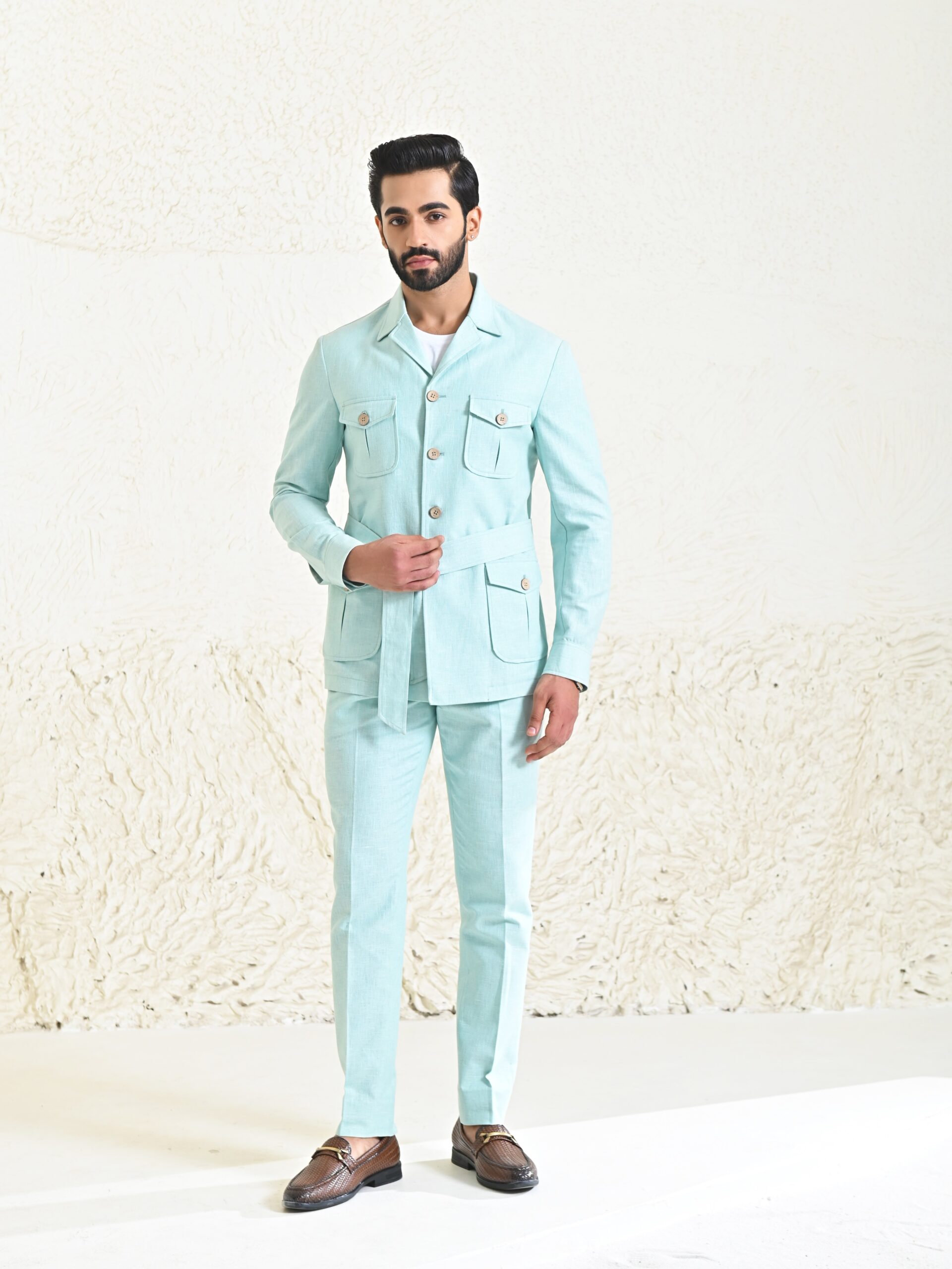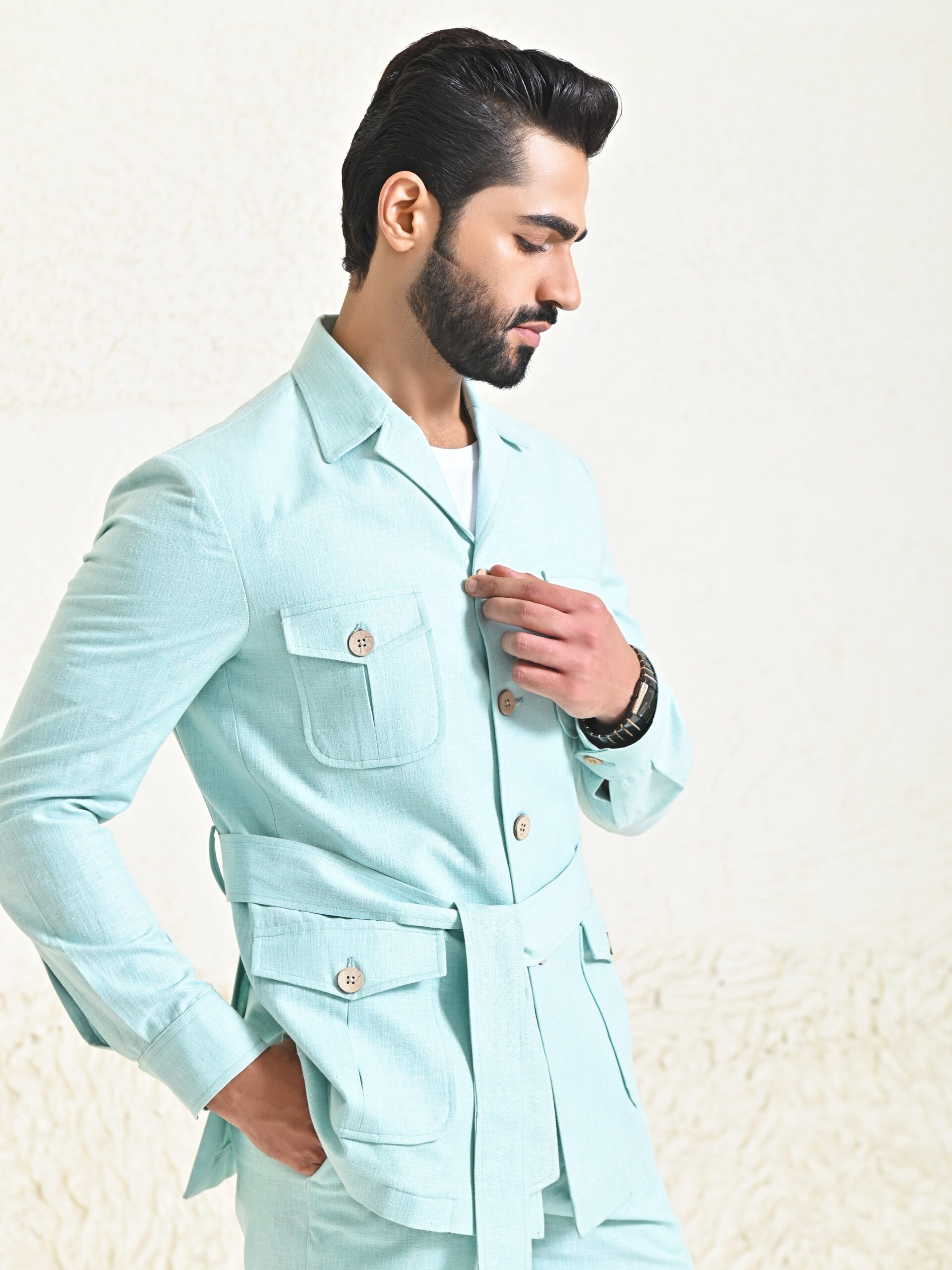 Introducing Pure linen Mint Green men’s co-ord set. Make heads turn with this effortless ensemble with wood buttons, classic 4-box pocket and a belt.