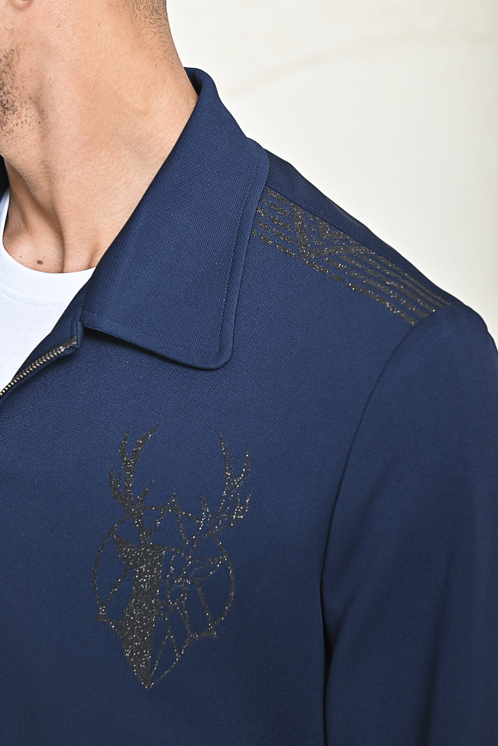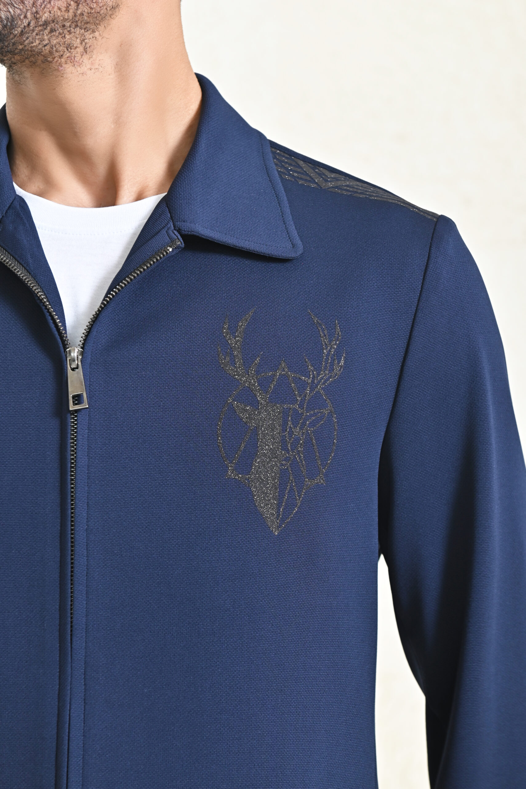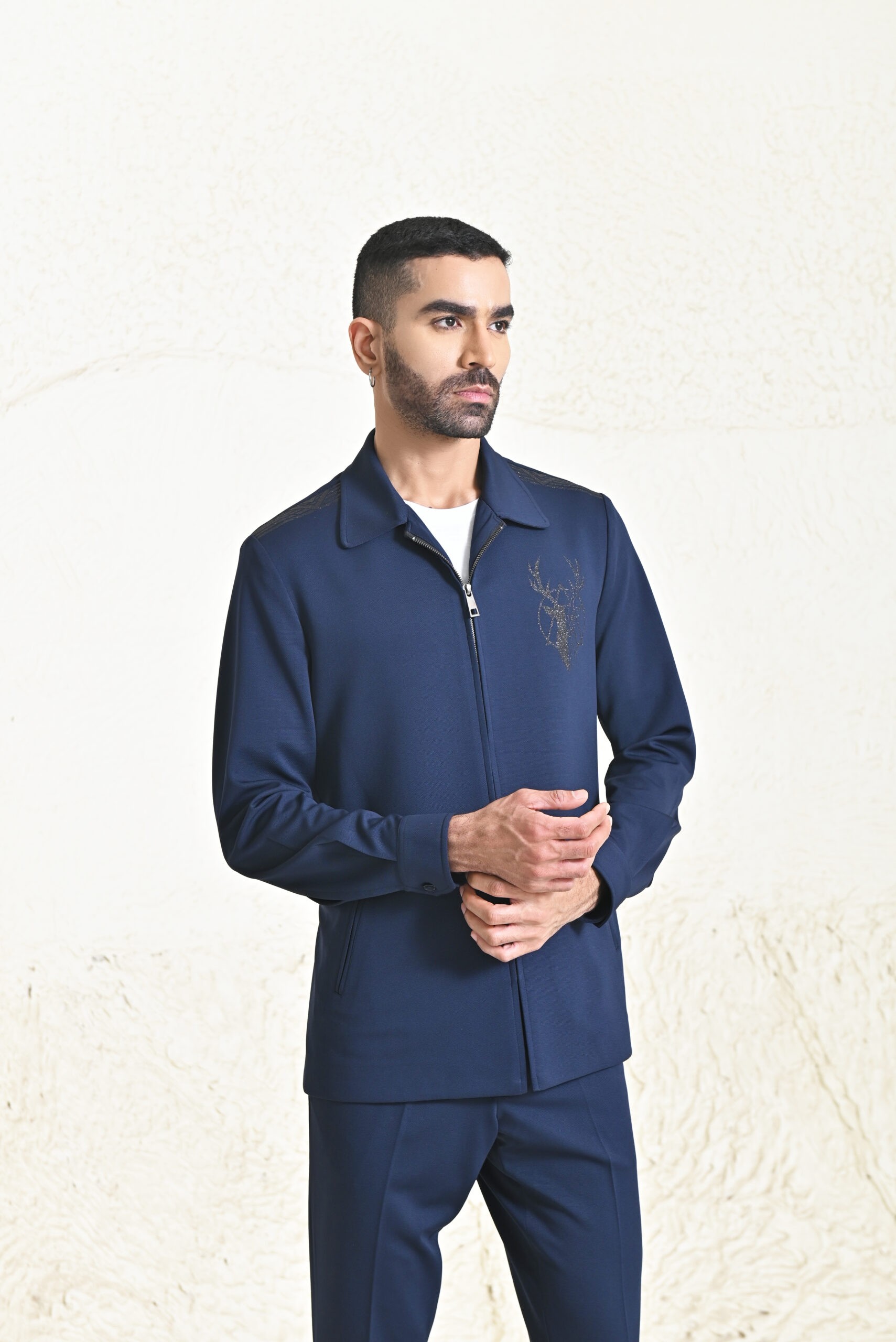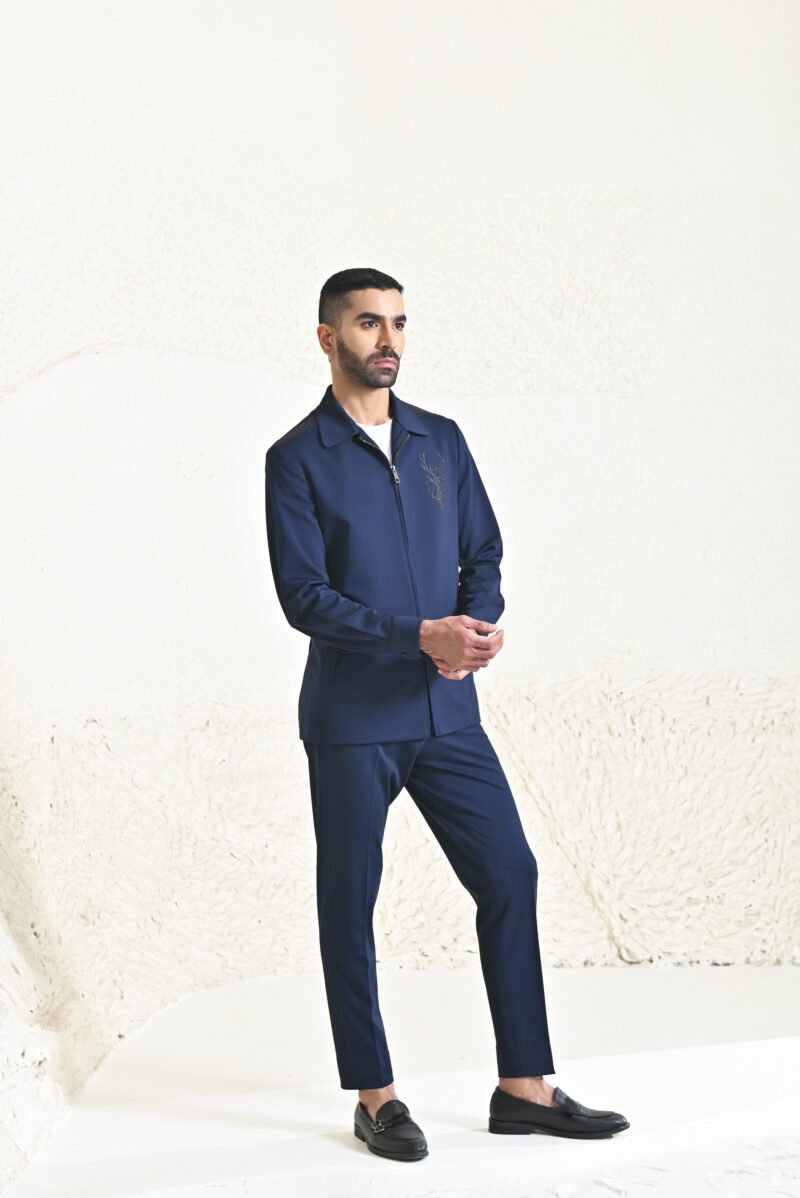 This navy co-ord set, crafted from comfortable knitting fabric, features a unique designer motif for added style. The matching trousers complete the look, while the regular fit ensures comfort and a relaxed, fashionable vibe.