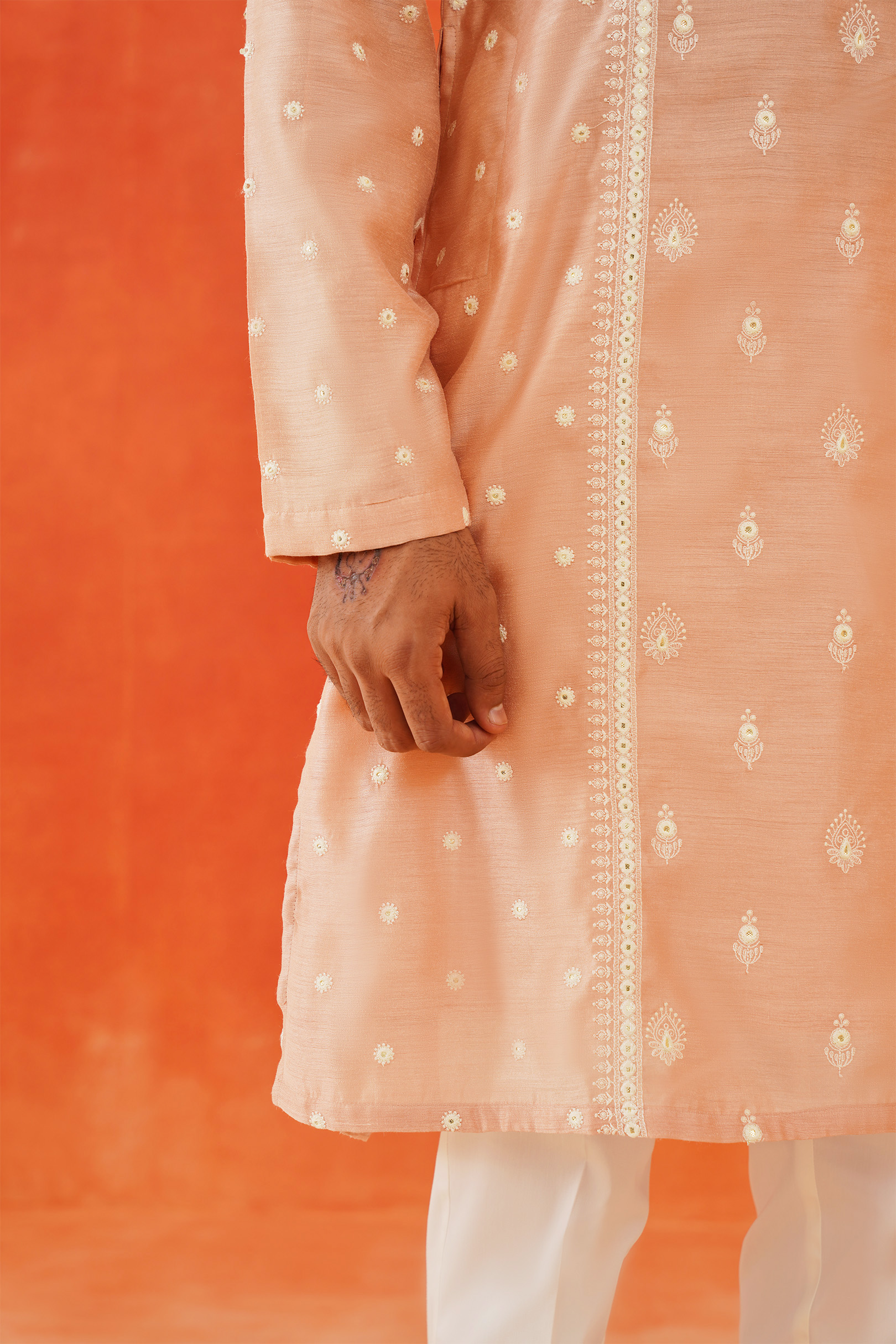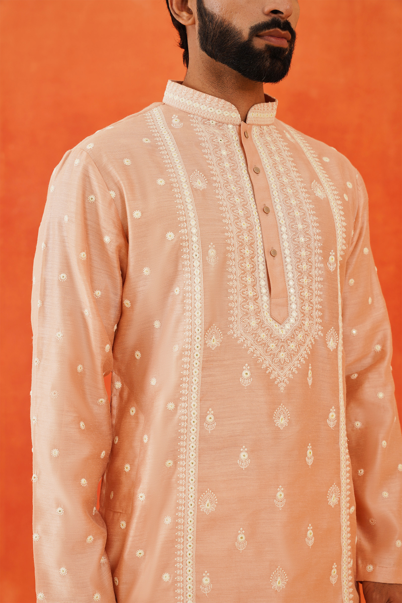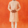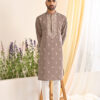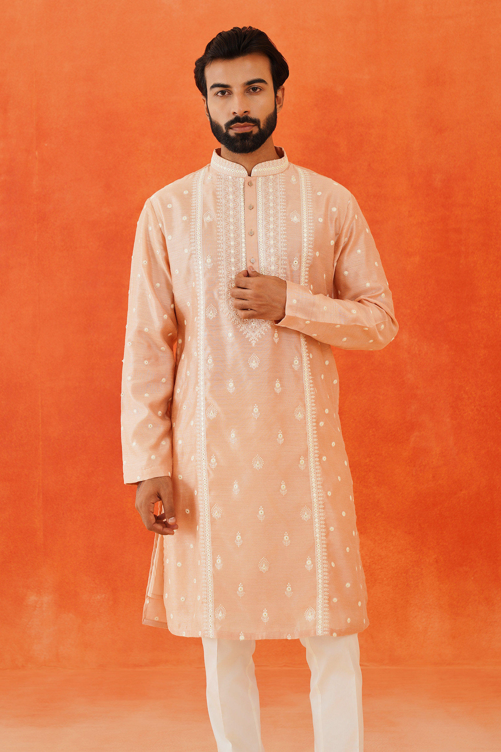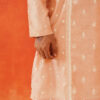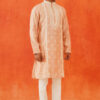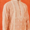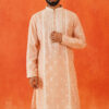 The Pink Embroidered Kurta features intricate white thread embroidery on a luxurious blended silk fabric. This elegant design highlights the craftsmanship and adds a refined touch to the sophisticated pink base.