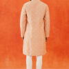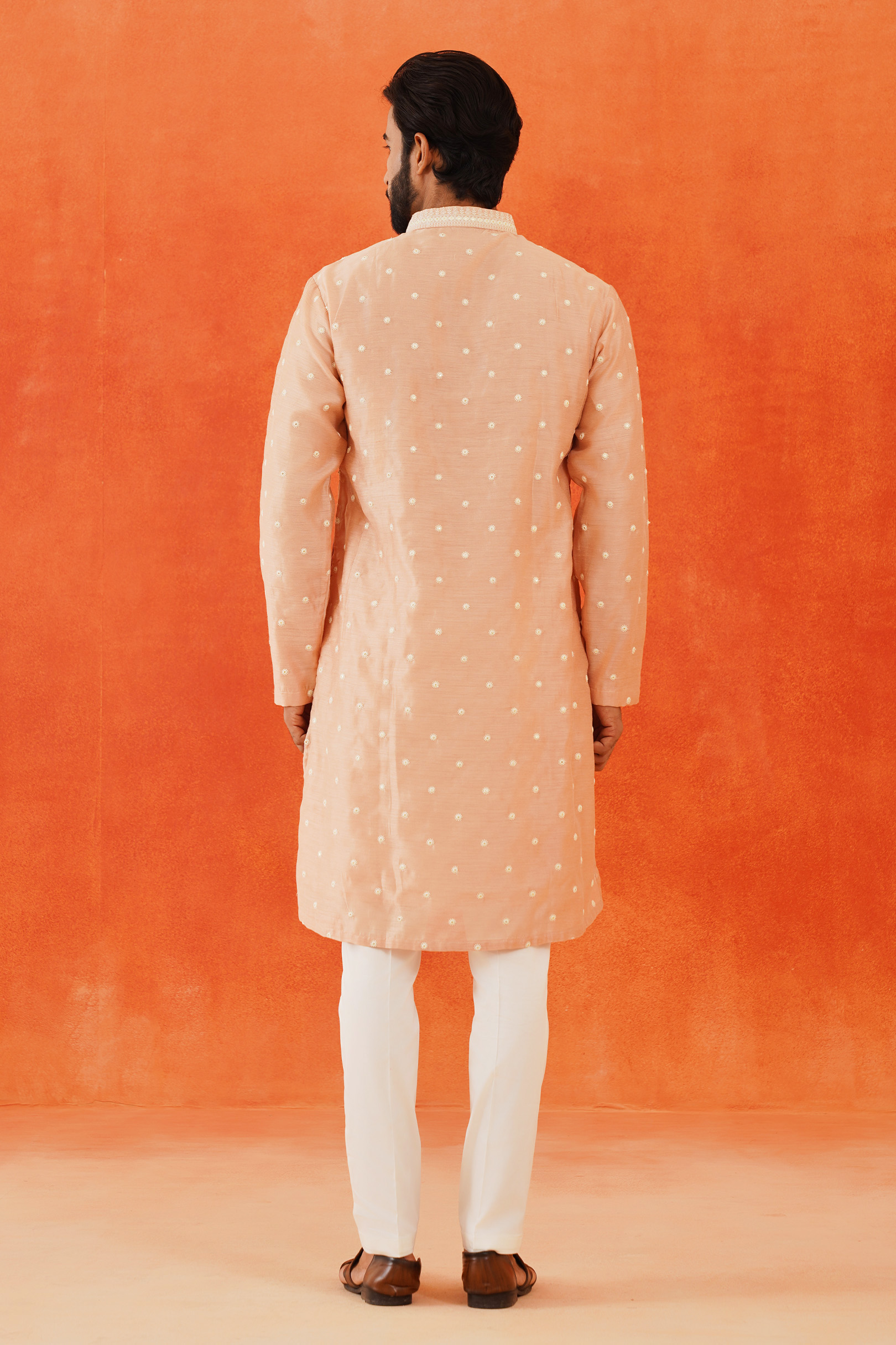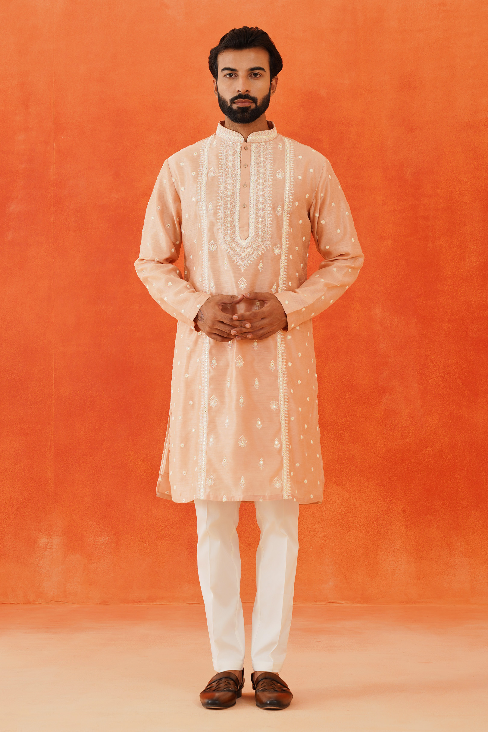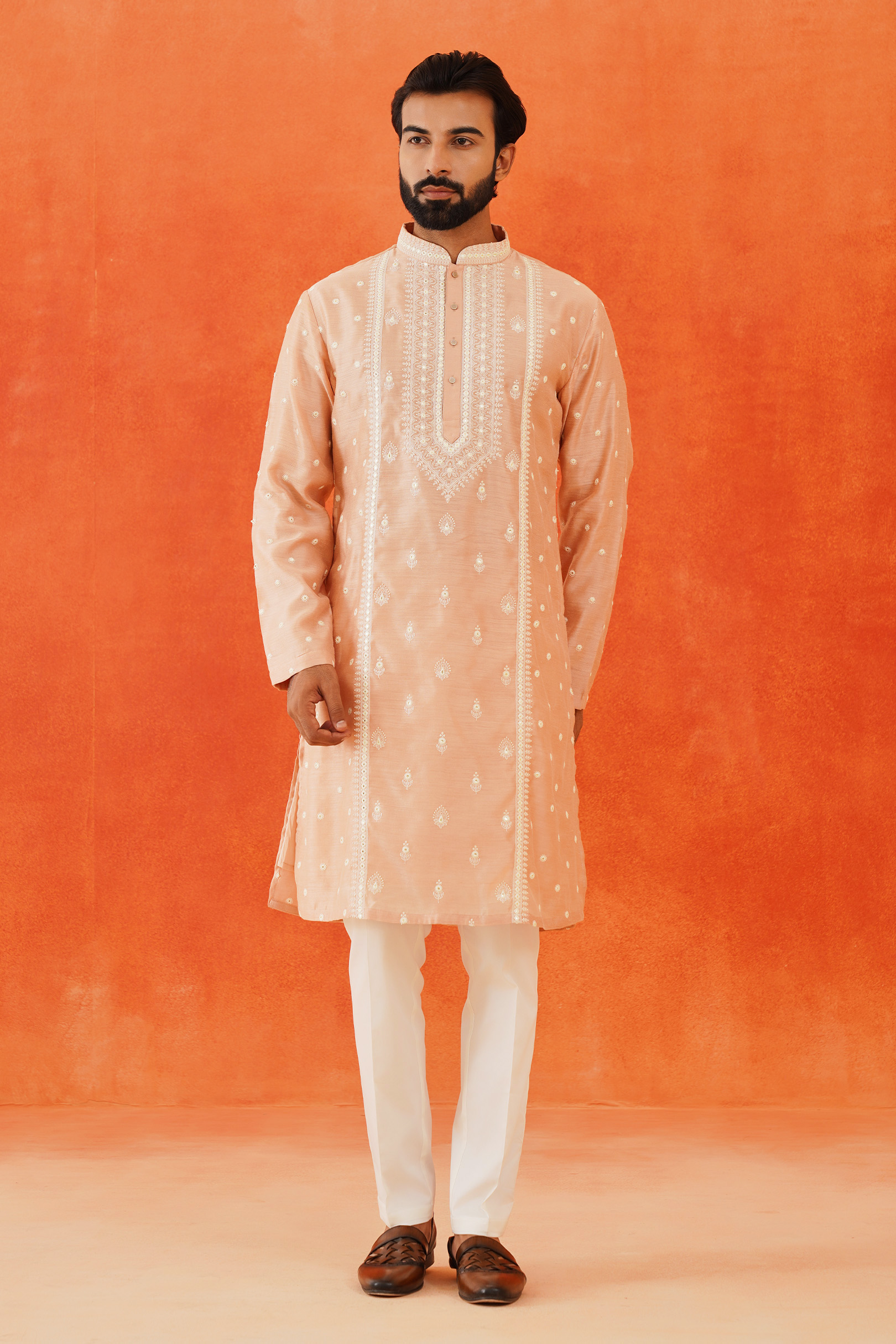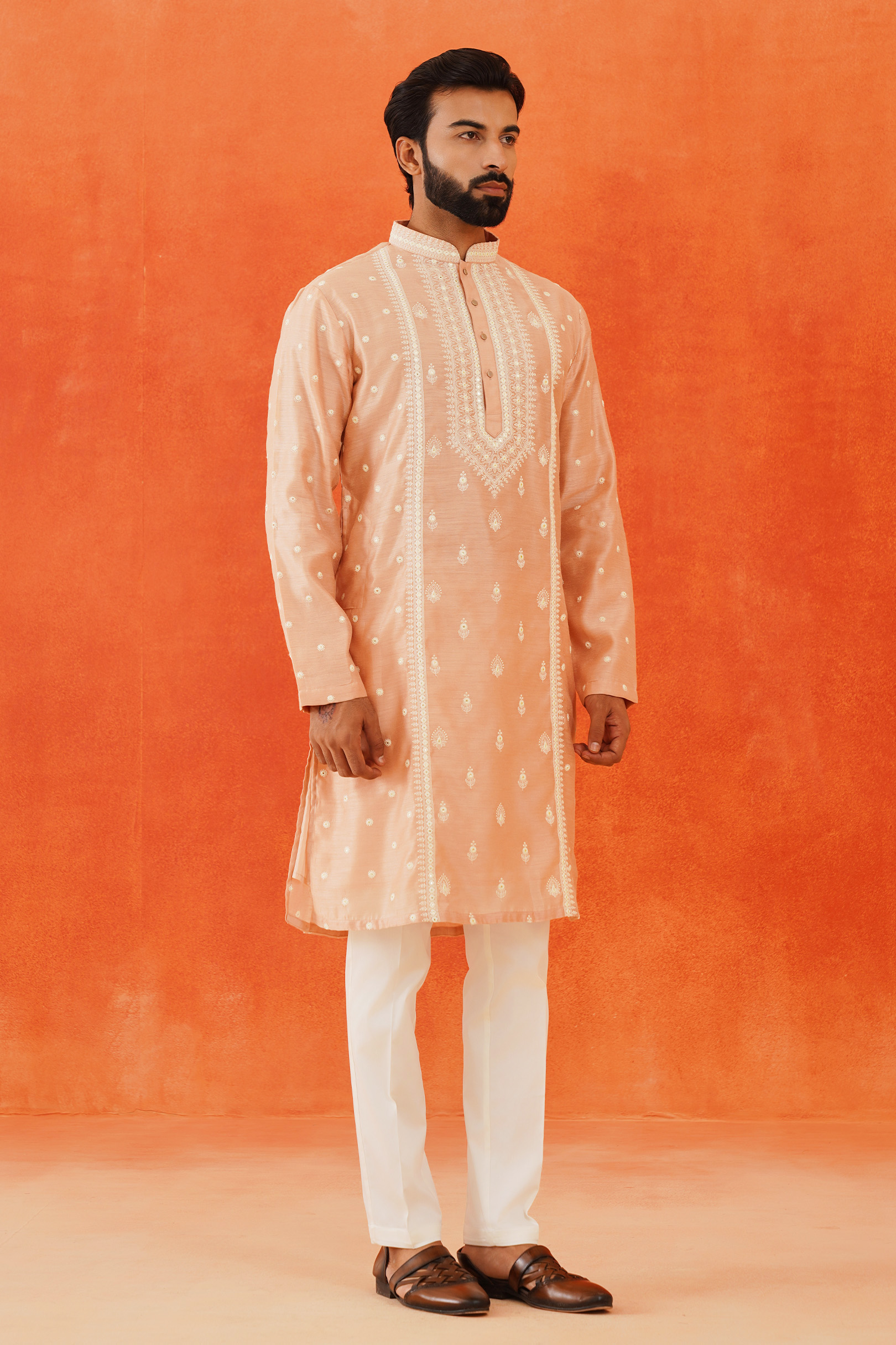 The Pink Embroidered Kurta features intricate white thread embroidery on a luxurious blended silk fabric. This elegant design highlights the craftsmanship and adds a refined touch to the sophisticated pink base.