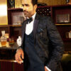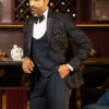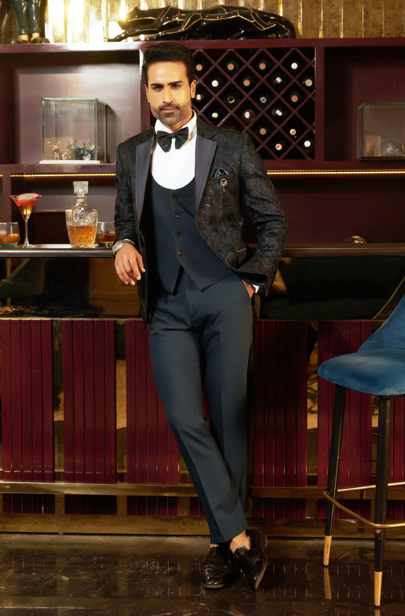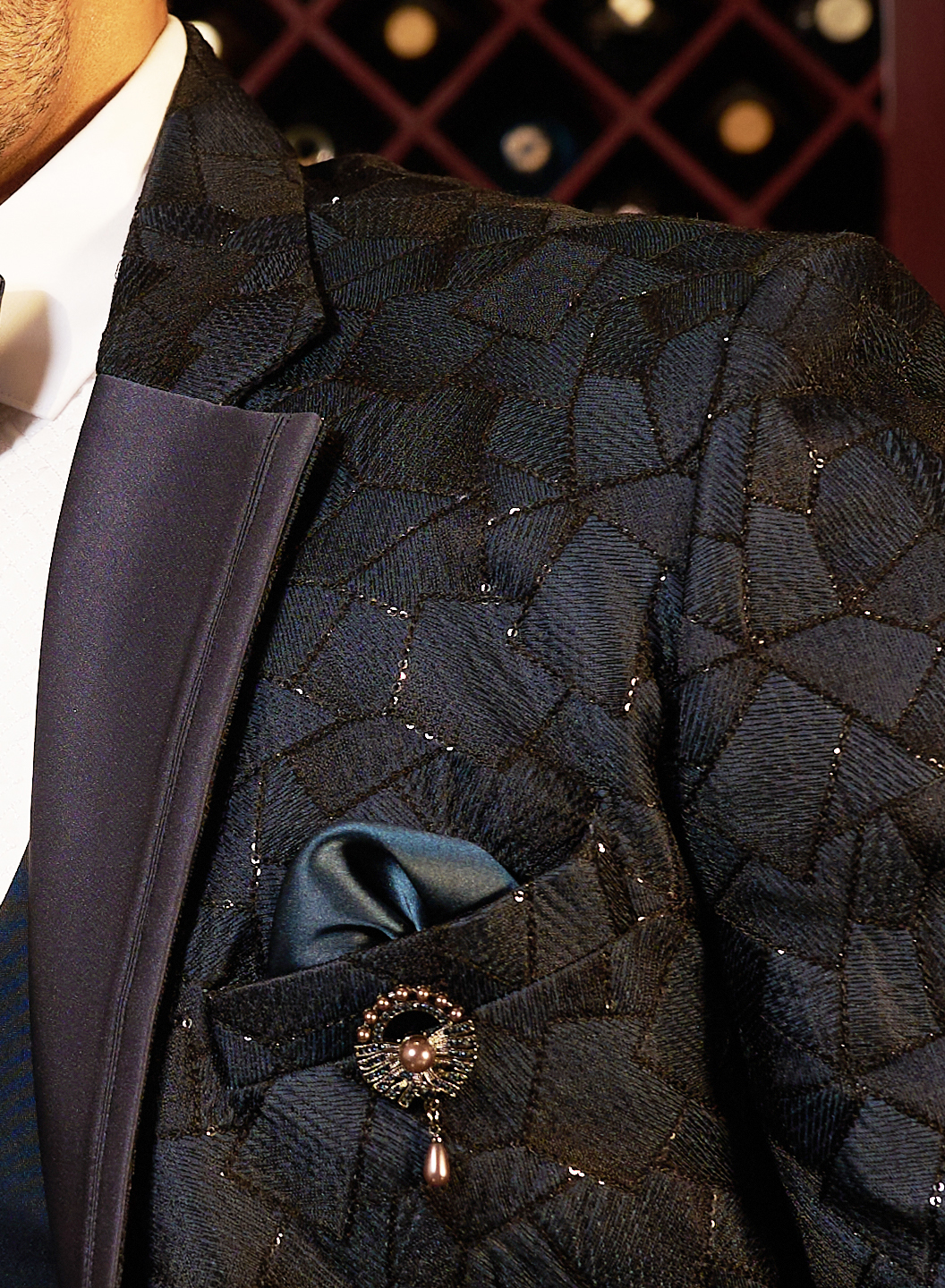 Teal embroidered suit features a U-shaped waistcoat and matching trousers in soft terry rayon. With intricate embroidery and a regular fit, it’s perfect for formal occasions