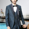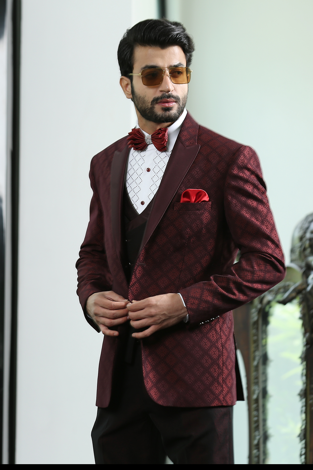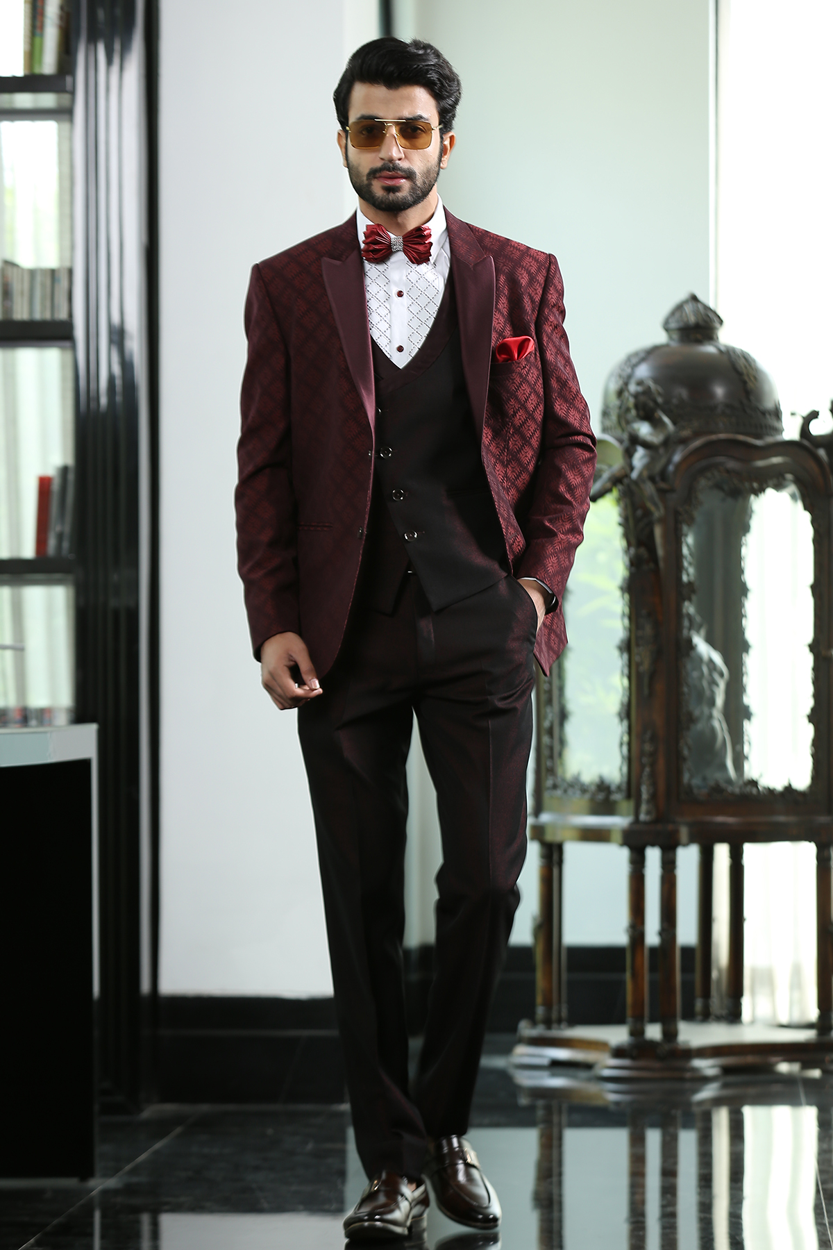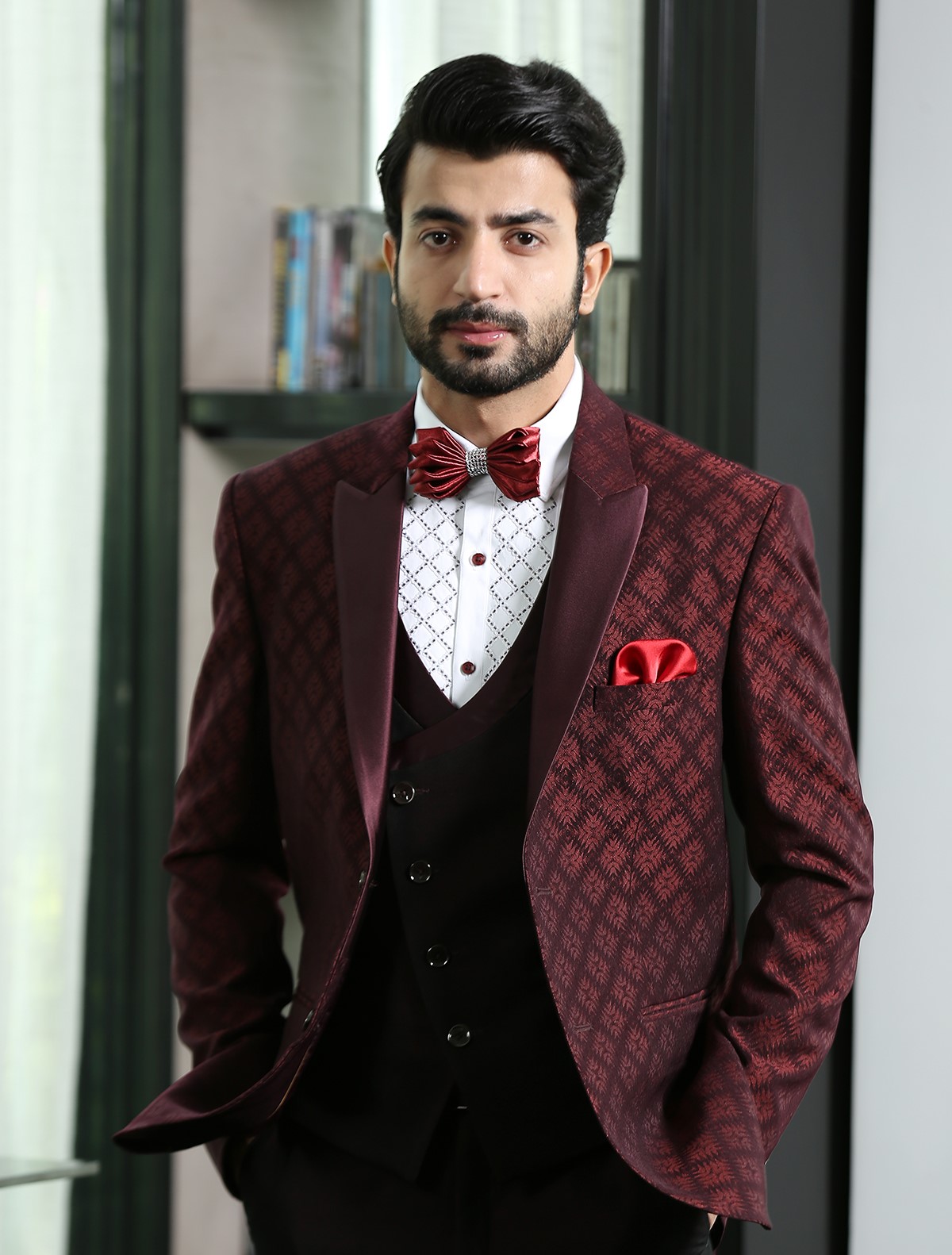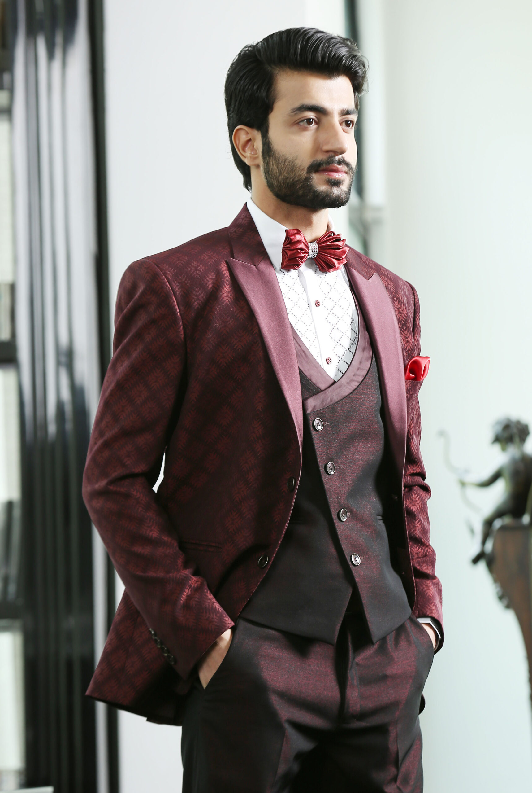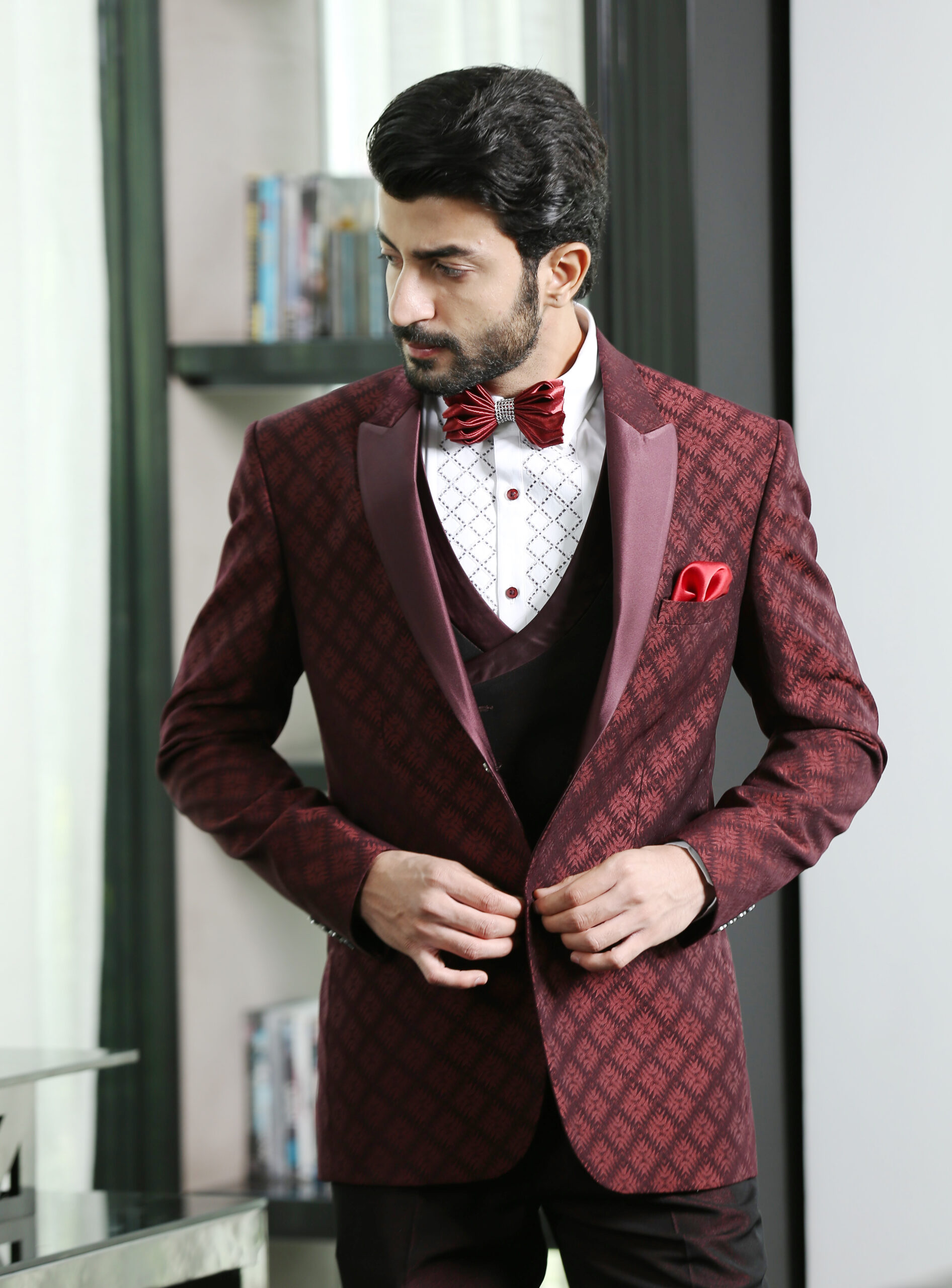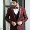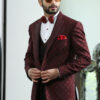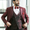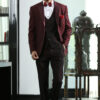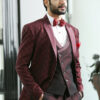 Wine Peak Lapel Jacquard Suit with Wine Satin on Lapel and Styled Double Breasted vest.