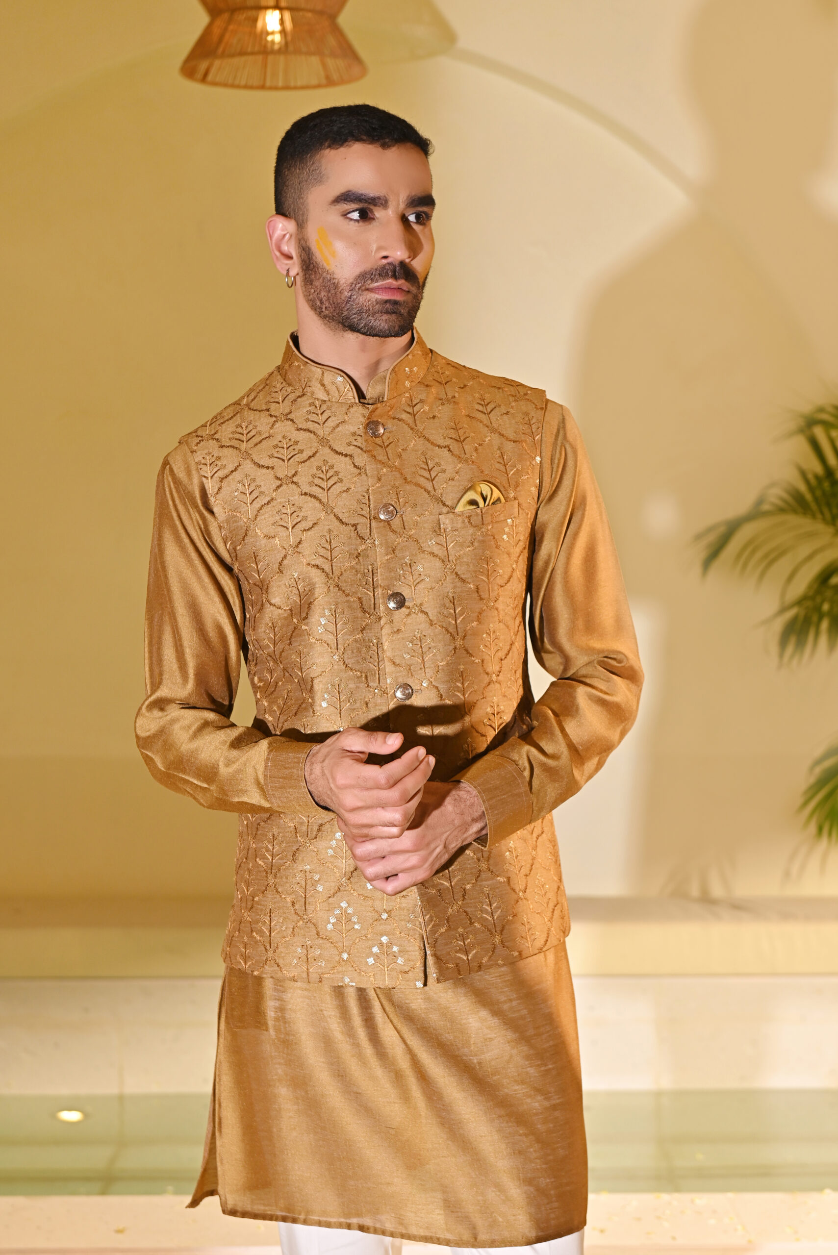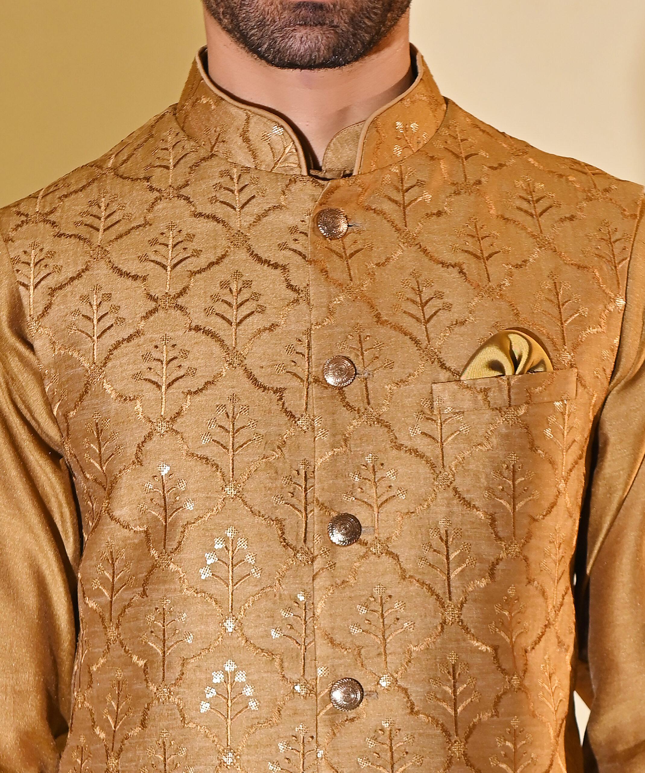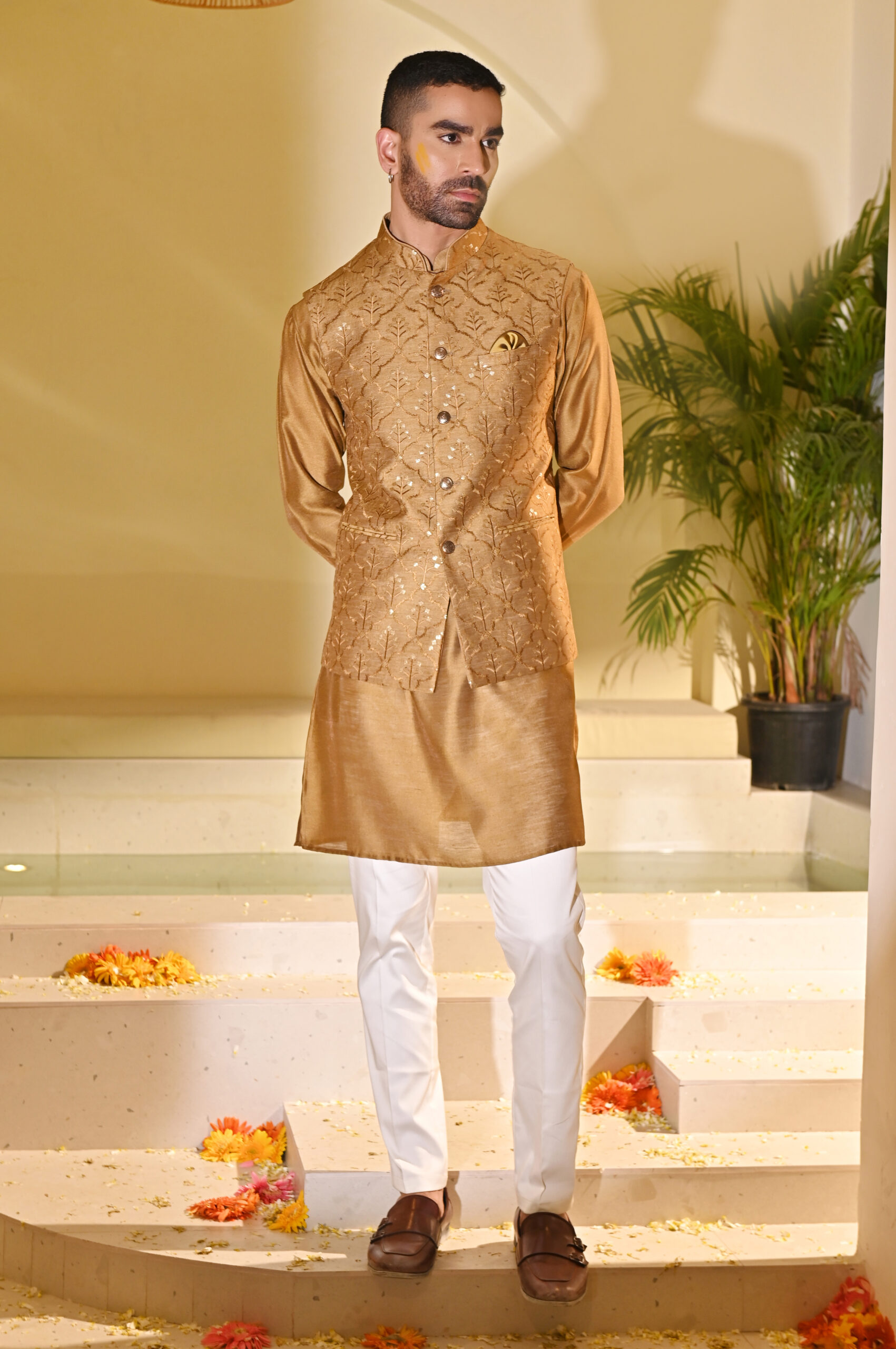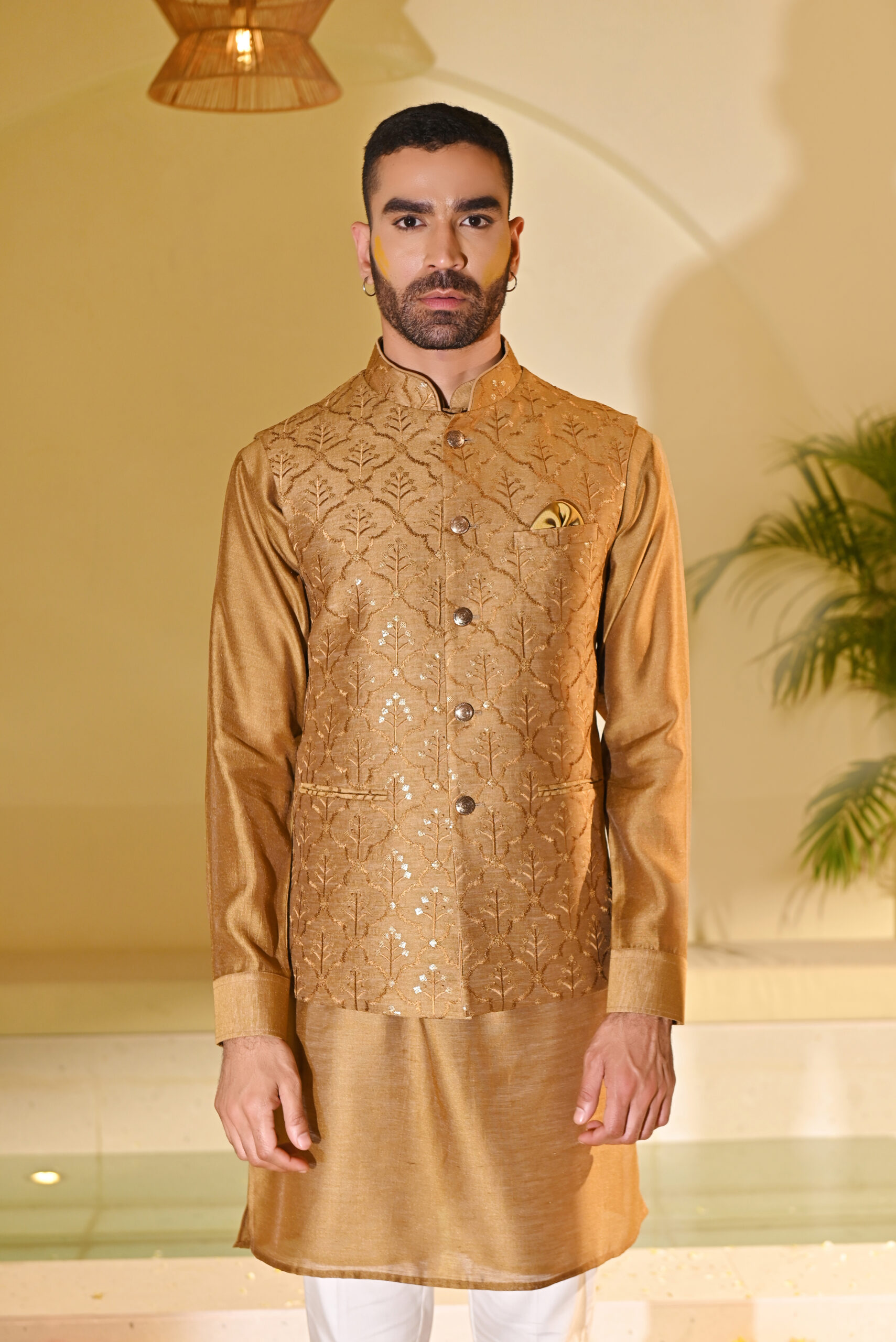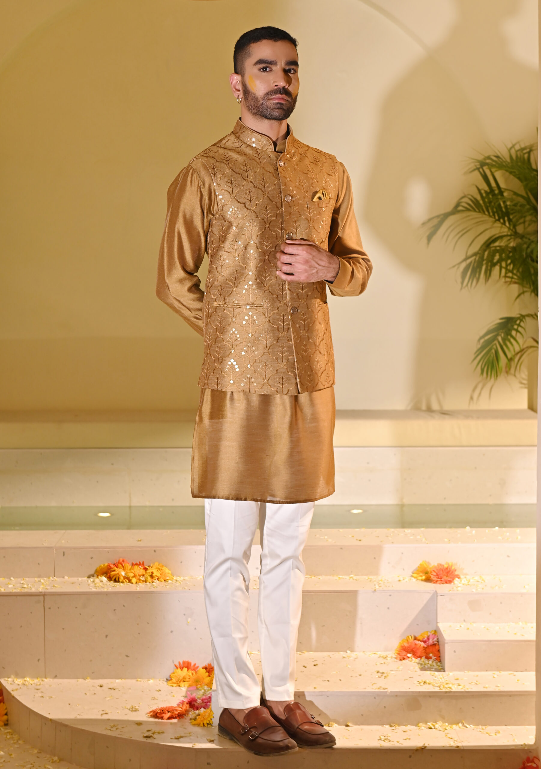 Bring festive vibrance to your wardrobe with this Yellow Embroidered Kurta Bundi Set. The kurta is paired with a classic bundi (Nehru jacket), intricately embroidered to add richness and sophistication. The cheerful yellow hue makes it a standout choice for haldi ceremonies, weddings, receptions, and traditional gatherings. Tailored with precision, this ensemble balances comfort, tradition, and modern elegance, making it ideal for special celebrations.
